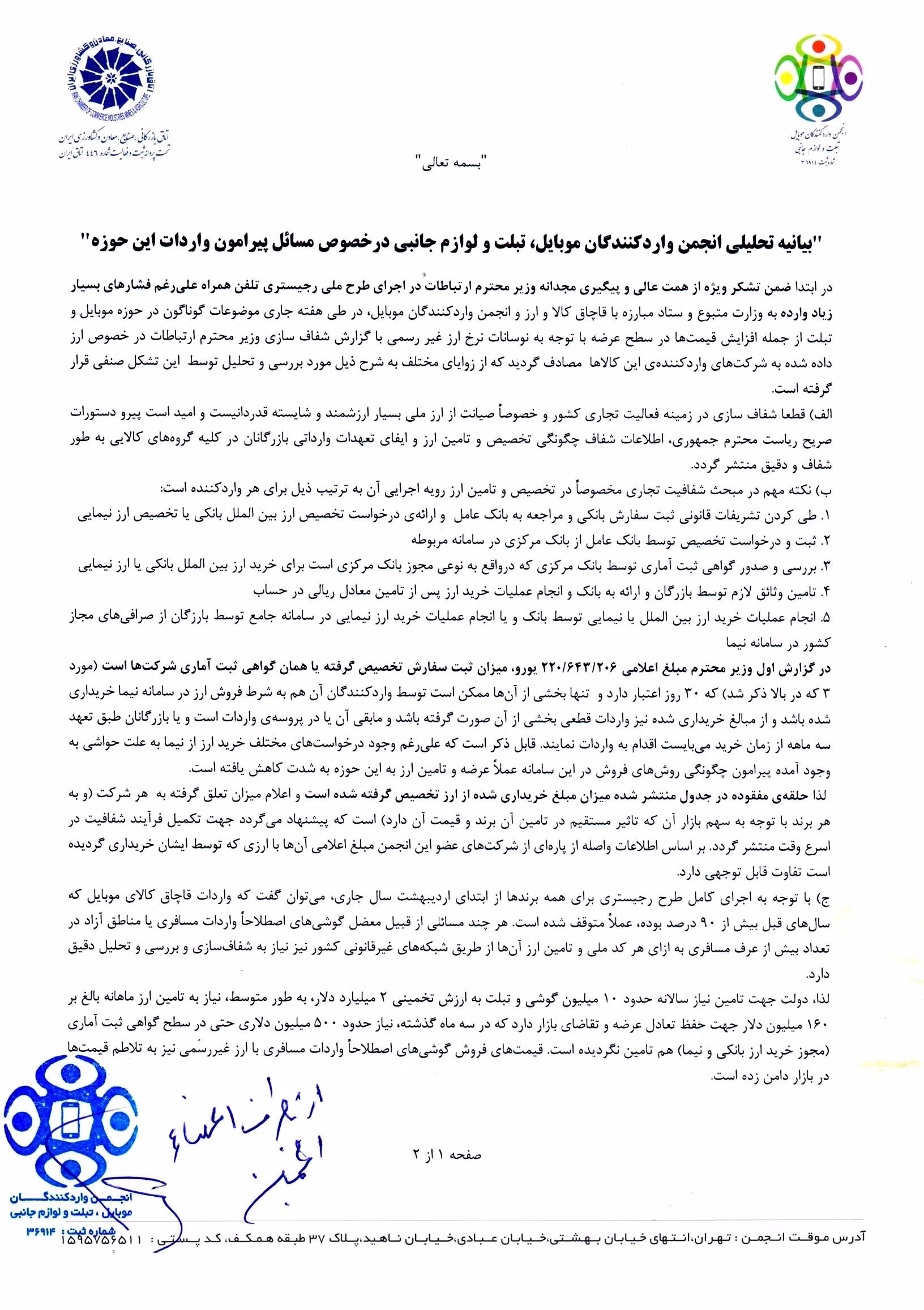 ح) پیشنهاد مشخص انجمن واردکنندگان موبایل و تبلت برای عبور از بحران فعلی، تشکیل کارگروه ویژه با حضور نمایندگان و دولت، بانک مرکزی، ستاد مبارزه با قاچاق کالا و ارز و سایر نهادها و نمایندگان بخش خصوصی (انجمن تخصصی این حوزه و اتحادیه ها و اصناف) جهت بررسی کلیه ابعاد پیشروی این بازار و حل دغدغههای مهمی از قبیل چگونگی تامین ارز منطبق بر نیاز بازار، تعیین و تکلیف بدهیهای اعتباری معوق واردکنندگان به طرفهای خارجی، چگونگی قیمتگذاری در حوزه عمده فروشی و خرده فروشی با توجه به سربارهای مختلف وارداتی و نحوه ارائه خدمات پس از فروش و نحوه رسیدگی و پیگیری شکایات و احقاق حقوق مصرف کنندگان و جلوگیری از بروز بحران اشتغال در شبکه واردات و توزیع و خدمات پس از فروش، تجدید نظر در حوزه صدور مجوزهای واردات به برندهای بدون نمایندگی رسمی کالای این حوزه در ایران و ارائه راه های عملیاتی با دو هدف اصلی صیانت و پاسداری از ارز ملی کشور و حفظ حقوق مصرف کنندگان است.